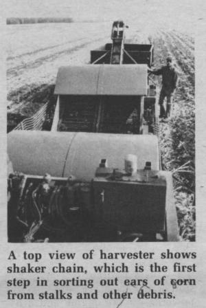 The two inventors field-tested the machine extensively last fall and again this spring and early summer. On one farm, an excellent 200-bu. crop was badly lodged due to extensive root worm damage. Miller and Resch were able to run their machine at widths up to 28 ft. and speeds as high as 6 mph, covering 20 acres per hour in fields which had already been harvested by a combine. Salvage "yields" ran as high as 80 to 85 bu. per acre in the 200 bu. per acre fields.
