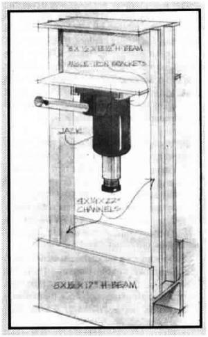 This press is ideal for small, tough jobs and can be easily taken to the field. To build, use two pieces of 4 by 1/4-in. channel iron 28 in. long, and two 8 by 1/2-in. H-beams, one 131/2-in, long and the other 17 in, long. Weld the 4-in. channels to serve as vertical supports between both 11-beams. Note that the press is built using the shorter 11-beam on the bottom, with the flat surface down. Both beams are in the horizontal position, but the top 1-1-beam is turned to be 90? offset from the bottom beam, with its face in the vertical position.