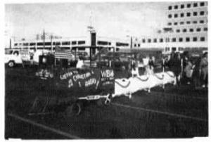 Kids love this look-alike steam engine I built to mount over my Allis Chalmers lawn tractor. Four bolts hold it on and it's got its own battery, lights, horns, radio and public ad-dress system. To go back to mowing, I just lift the train off and put the mower back on. For parades I made 5 cars out of 50-gal. drums to p
