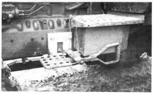 Gamble removes both the first and second steps and then bolts a mounting bracket to the side of the tractor - using existing bolt holes - that holds both the second step and the pivoting stirrup step. The step pivots on a large bushing that's fitted with a spring and detent ball. Once you're up, you just give it a nudge with your foot and it pulls up horizontally and stays there. To get down, you just kick it down with your foot. The step hangs down 14 in. below the second step.