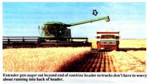 Gleaner N & R Series combines are ex-tended 4 ft. by replacing original 12-ft. long factory auger tube with 16-ft. tube and auger extension. Prices for extender kits vary from $595 to $695 (Canadian), depending on make of combine and length of extender.