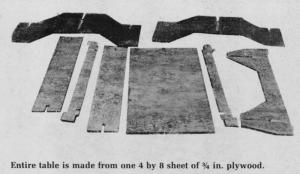 The 28 in. high table is made out of one 4 by 8 ft. sheet of 3/4 in. plywood. The eight sections can be put together or taken apart in minutes ù there are no screws or bolts ù and easily fits in the car trunk for carrying to a favorite picnic spot.