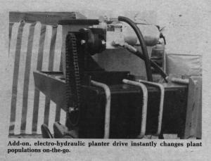 Planter drive provides space age control PLANTING EQUIPMENT Accessories 9-6-2 Changing plant populations on-the-go can now be as easy as turning a dial thanks to a new automated planter drive add-on system developed by Hydraulic Control Systems, Inc., Monticello, Iowa.