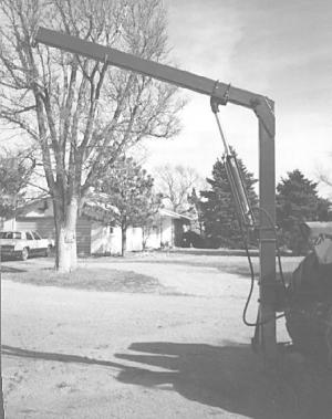 "There are a couple portable hoists on the market that offer as much clearance as mine, but they're expensive. This one cost virtu-ally nothing to build," says Harold Witulski of Beatrice, Neb., about his high-reach, 3-pt. mountable lift hoist for working on center pivots.