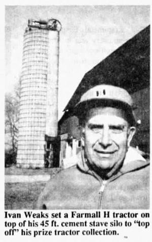 Ivan and his wife Beulah own five acres plus a 45 ft. cement stave silo and some buildings there, and the fact that he now has a Farmall H sitting on top of his silo doesn't really surprise anyone who knows him: