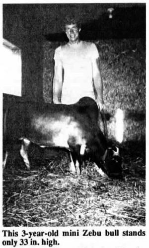 Miniature Zebus are an old breed of cattle. They were imported from the southern part of India into the U.S. in the 1920's for zoological gardens. Very few were brought in, and even today there are probably less than 800 in the U.S. "We've tracked down all the known breeders in the U.S. and there are less than 60 of them," says Charles Wilson, Zebu breeder near Hernando, Miss. "These are fully formed animals, not dwarves. There has been some interest in developing the breed for use in tropical countries where farmers have small pastures. They're a multiple use breed (milk and meat) and can also be used as draft animals."
