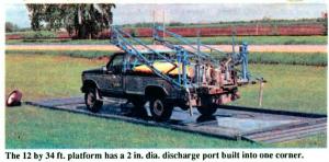 The 12 by 34 ft. platform with a 5 in. lip along all four sides resembles a giant metal cookie tray made of 7 ga. steel. It holds 1,275 gals. and is equipped with a 2 in. dia. discharge port built into one corner. "For complete drainage of any spilled material, the end opposite the discharge outlet can be raised a foot or two with a tractor loader or forklift," notes Ron Stoen, manufacturer.