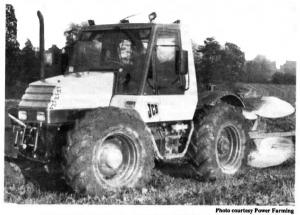 The tractor is powered by a Perkins 4-cylinder diesel engine available as either naturally aspirated (125 hp) or turbocharged (145 hp). The transmission has 18 forward speeds and 6 reverse. The tractor has four equal-sized tires and is equipped with front wheel drive. A front hitch and pto is avail-able. A platform behind the cab has a capacity of up to 21/2 tons and is used for carrying bales, tools, seed, and fertilizer. The cab is fitted with two seats side by side.