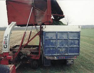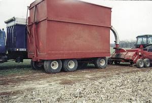 "The apron chain lets us put a mound of silage at the center of the box that's about 3 ft. higher than the sides. Our wagon is equipped with six big 16-in. high, 21-in. wide flotation tires and can go anywhere a conventional wagon can go. It works better than unloading directly from the chopper into the truck because fewer trucks are needed and because it causes less compaction."