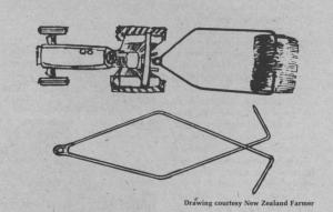 Russ Johnston, Marton, New Zealand, built a simple round bale feeder using a length of 1/2-in. reinforcing rod. According to a report in the New Zealand Farmer, Johnston bent the rod to the shape and dimensions shown in the diagram. The rod is bent so that in the rest position the arms cross each other. This means they must be pulled apart to fit into the bale and therefore the prongs are held in the bale under tension.