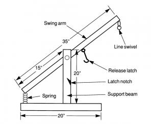 "A sturdy spring provides action. You can make the release latch from sheet metal or welding rod. Drill a hole in the end of the swinging arm, insert your swivel and line, and you're set for a day's fishing."