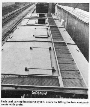 Piester's two-ton covers each have four 2 x 8 ft. doors for rapid filling of the four compartments in each car. An average 50 ft. coal car, says Piester, can hold about 3,300 bu. of grain - only 200 bu. short of the capacity of present jumbo grain hopper cars.