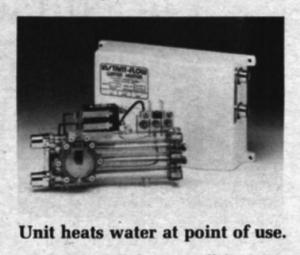 The Instant Flow unit is just 6 in. by 9 in. by 2¢ in. and installs under the sink. Requires a 220-volt hookup to power its resistant electric coils, which are activated instantly, by a flapper valve that moves when the flow of water is started by the hot water tap. Made from all-plastic and stainless steel, and designed to last the life of the plumbing with no maintenance.