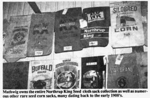 Other rare seed corn sacks in Mathwig's collection include a 1924 Dekalb sack, a 1948 Jacques sack, and the first Funk Brothers sack. He owns the entire Northrup King Seeds cloth sack collection and has even received an offer from the company to buy the set. He has seed corn sacks distributed by Montgomery Ward, Sears & Roebuck, 'and Gamble's, and some sold by South Carolina and Tennessee plantations. Most sacks bear the names of the 16 original sack-producing factories in the U.S. and Canada, including Bemis, Chase, Cincinnati and Fulton, four companies that are still in business.