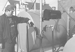 David Adcock of Atwood, Ill., has a fueling center with some good ideas to help keep nozzles clean and hold fuel delivery notices protected in fine order. He welded a short piece of pipe to the center pipestand and attached two short lengths of heavy-duty rubber hose to hold fuel nozzles. There's a drain hole in the short cross pipe so water and snow can drain out. Nozzles stored like this stay free of dirt and insects. He also mounted a mailbox on the center pipe. It serves the dual purpose of holding delivery papers and, when the flag is raised, indicates that the tanks have been filled. (C.F. Marley, Nokomis, Il.)