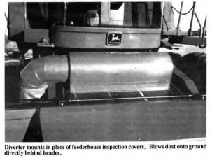 The dust vacuum mounts on the feeder-house throat and is powered by the combine's 12-volt battery. You simply remove the feederhouse inspection covers and use six self-tapping screws to mount the vacuum housing. The fan is wired to a toggle switch in the cab.