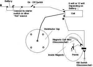 "The first thing you need to do is get a 6-volt ignition coil from any auto parts store for around $20. Then, disconnect the remote kill switch on the magneto. Wire the positive lead from the ignition coil to the points on the magneto, which act as a ground for the system. Wire the coil's negative lead to an electric on-off toggle switch and run the wire back to any hot point on the tractor's electrical system, such as the starter switch. With the flip of the on-off switch, you've immediately got plenty of power to start the tractor. Works like a charm and only costs about $25. Note: The wire from the points to the coil needs to be connected to the positive or negative terminal on the coil according to battery ground. The above description is for a positive ground system A negative ground system would be wired just the opposite."
