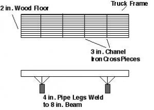 Heavy-Duty Feed Bunk Made From Old Truck LIVESTOCK Feeding Equipment 21-2-36 I made a heavy-duty feed bunk using the frame from an old truck and some scrap metal. The bunk consists of the rectangular of the truck mounted on legs made of 4-in. dia. pipe. A length of 8-in. I-beam runs under each end of the bunk. I welded in several 3-in. channel iron cross pieces along the length of the truck frame. Then I made a "floor" for the bunk using 2-in. lumber. It's built strong to last and didn't cost much. (Robert Ouverson, 24495 Eagle Ave., Fertile, Iowa 50434 ph 515 797-2484)