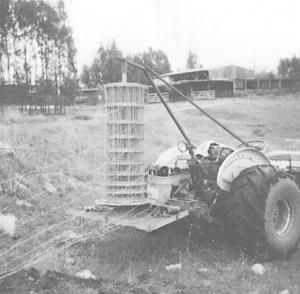 Wire Unroller Handles Barbed Or Woven Wire FENCING Tools 21-2-36 I know many of your readers have built their own wire unrollers but I think mine may be unique because it can unroll both barbed wire and big rolls of woven wire. It consists of a plywood platform that mounts on the tractor 3-pt., a few pieces of pipe, and a pair of disc blades. Short pieces of pipe weld to the discs. They turn inside larger pieces of pipe. Two long angle iron braces extend up from the frame of the tractor to anchor the top disc when unrolling woven wire. It works great and makes a much easier job of putting up fence. (Ervin Clark, 378 Lone Tree Rd., Oroville, Calif. 95965 ph 916 534-9307)