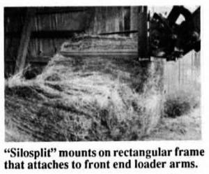 Developed in Sweden, the "Silosplit" knife mounts on a rectangular frame that attaches to front end loader arms in place of a bucket. The upper edge of the Silosplit is rounded so it can be used to pick up and transport bales and is also equipped with a second small stabilizer tine that keeps the bale from turning when handled.