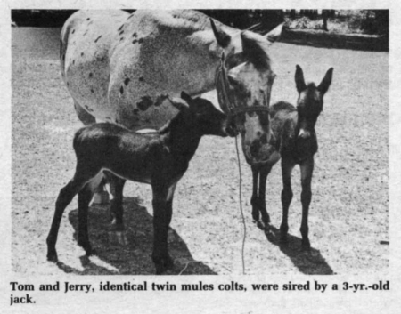 Neitawana gave birth to the mule colts without any assistance. Tom was 36 in. at birth and Jerry 35 in. Robinson expects the twins to grow to about 1,000 lbs. or more. He plans to use them to pull wagons for parades.
