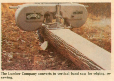 The saw features a narrow-kerf bandsaw blade that minimizes waste. It cuts full width boards from logs up to 23 in. in dia. Logs of any length can be cut into boards from 1/8-in. to 5 in. thick for any purpose. Two men can produce up to 500 sq. ft. of dimension lumber in one 8-hr. shift. The portable sawmill's industrial 5-hp, 4-cycle engine operates on 2 gal. of gasoline over an 8-hr. work day. Hand-operated throttle controls the cutting speed as saw glides on flat surface across the log.
