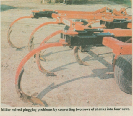 In three years of use, his modified chisel plow has yet to plug up, says Miller. "I've even operated in heavy corn stalks in the rain without a single plug up. Heavy trash flows through it evenly without bunching up."