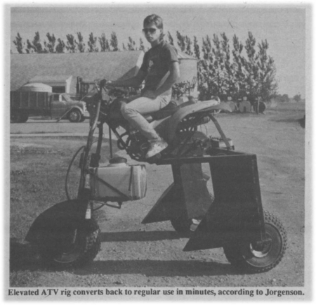 "It's one way to turn accident-prone 3 wheelers into a safe and practical. alternative use," says Minnesota farmer Mike Jorgenson, of Montevideo, who teamed up with local blacksmith Jim Adolph to turn a 175 cc Kawasaki 3-wheel ATV into a "clean bean" machine for spraying soybeans and other row crops.
