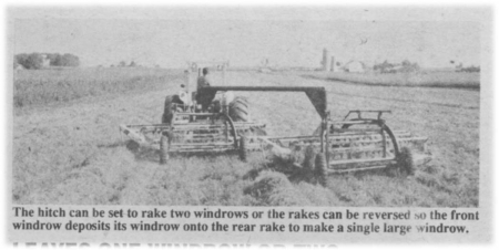 The two hitch posts and "gooseneck" were made out of 4-in. dia. steel pipe. A 2-in. dia., 16-in. stroke cylinder turns the front hitch one direction and a steering linkage that runs through the pipe frame, steers the rear wheels in the opposite direction. The result is that both rakes move far enough to the side so that tractor wheels don't run over either swath. To rake into a single large windrow, the position of the rakes is reversed so that the front rake deposits its windrow onto the rear rake. For transport the cylinder is pulled halfway so that both rakes trail in a straight line, one behind the other.