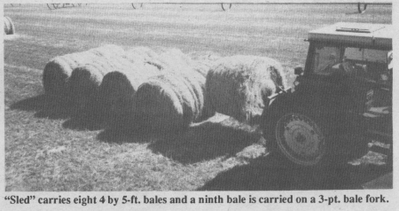 Chandler Haggard, Gustine, Texas, built the sled as an alternative to complicated hay-hauling trailers. It consists simply of an 8 by 16-ft. sheet of 1/2-in. thick plate steel that slides over the ground towed by chains.