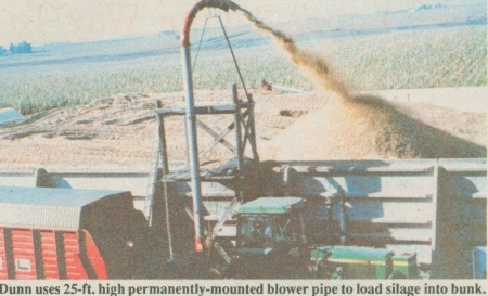 "Other farmers in my area unload silage on-the-go from a wagon into a bunker silo that's open on both ends," says Dunn, who feeds 1,100 beef cattle. "The tractor and wagon can get stuck if the silage isn't packed down well enough. We can unload a wagon load of silage into the blower in 5 min. and there's no chance of getting stuck. Using the blower also allows us to close up one end of the bunker silo and build a shorter but taller silo that takes up less space."