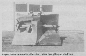 "It works beautiful because it combines the benefits of a snowplow and a snowblower," says Stoudt. "I had been using a V-plow on my 450-ft. long driveway, but it took too much time and left windrows that caused further drifting. It worked fine in shallow snow, but had trouble in deep snow. The augers on my snowblower throw snow far enough out to avoid windrows. I don't use it in shallow snow because snow would just be bulldozed out to the sides. It works better than commercial snowblowers which constrict snow into a central fan, forcing you to drive slow. My snowblower doesn't have a central fan or tube so I can go at speeds up to 2 1/2 mph.