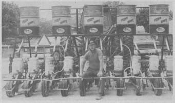 "It lets me plant 35 acres of soybeans on one fill. Saves a lot of time," says Donald Anderson, Alberta, Va., who mounted five 55-gal. steel drums on his 10-row no-till soybean planter.