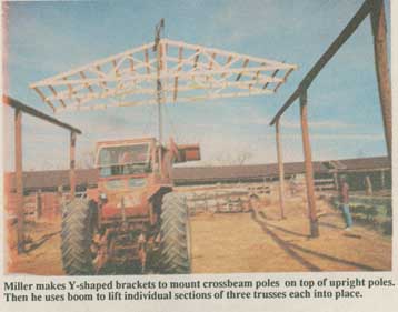 "I've come up with an easier, safer way to put up pole hay sheds or any other building by putting three trusses together at a time on the ground and then lifting the sections up onto the pole frame together," says Thomas F. Miller, Trinidad, Colo., who's built three hay sheds using his method.