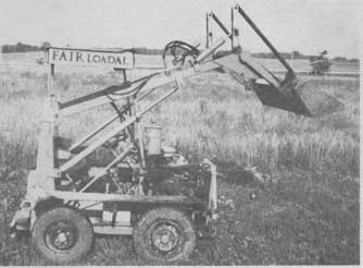 Fair built a steel frame to mount the engine and hydraulic pump (salvaged from an old New Holland swather) that operates the loader. The pump is belt-driven by the engine. He made a firewall to mount the voltage regulator, clutch and gas pedals, and dash. He used 2 by 4-in. sq. steel tubing to make the loader arms and made the bale fork as well as three different buckets (the one shown measures 5 ft. wide, 14 in. deep, and 12 in. high). "The small size of the bucket and a 100-lb. weight mounted at the rear of the loader keeps it from tipping," notes Fair. "I use two small power steering cylinders off an old Case combine to dump the bucket. I pull two pins to remove the bucket and two more pins to remove the bucket's dump cylinders. The hydraulic control levers were borrowed from an old Ford tractor."