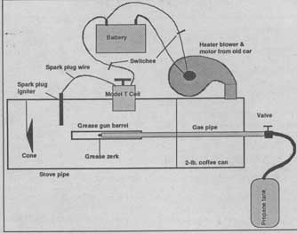 The body of the heater consists of a short length of stove pipe with a 2-lb. coffee can attached to close off the back end. A 1/4-in. dia. gas pipe is inserted through the bottom of the can into the center of the stove pipe. A grease zerk, with the ball and spring removed, is inserted into the end of the pipe, which is surrounded by the barrel of a grease gun. A 3-in. dia. metal cone is positioned 3 in. from the end of the grease gun barrel. A spark plug igniter, energized by a Model T coil, mounts just above the end of the grease gun barrel.