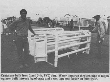 Crates are built from 3 and 2-in. dia. pvc pipe and are lag bolted in place. The fittings and bottom supports are made from stain-less steel. A stainless steel "wet-type" sow feeder is attached to the removeable front gate for easy cleaning. Both the front and rear gate are opened with one pin on each side. A 1/2-in. pvc water line delivers water both to the sow feeder and to a piglet nipple waterer built into one leg of the crate.
