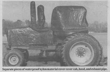 Covers are made from a lightweight, tear-resistant nylon material that's waterproof. Separate pieces cover the cab, hood, and exhaust pipe. The cab cover and exhaust cover are joined to the hood cover by velcro strips. Bunge cords are used to secure the hood cover to the tractor.