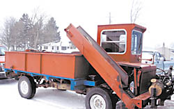 The machine is equipped with a hydraulic-operated splitter on front and a 10-ft. long conveyor on one side (off an an old New Idea corn picker) that drops wood into a wagon box. The operator sits in the comfort of a homemade wooden cab. There's even an electric horn on front that's off the same Blazer.