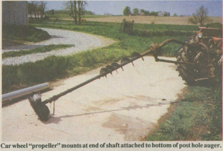 An Ohio hog producer made his own manure pit agitator out of an old 15-in. car wheel cut like a"propeller". The car wheel propeller mounts below an old 3-pt. post hole auger.