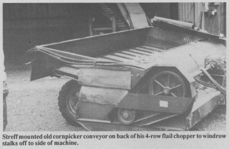 "There wasn't anything on the market that would do the job," says Iowa farmer Al Streff, who mounted an old corn picker conveyor on the back of his 4-row flail chopper to windrow stalks off to the side of the machine.