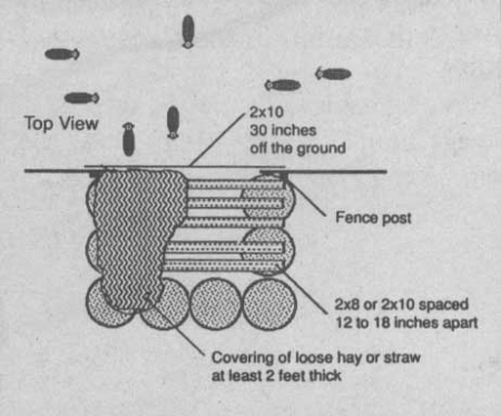 Bales were stacked 2-high on end in a U shape with two bales on each leg and four bales across the bottom. Four planks are placed across the top of the bales and loose hay or straw spread on top of the planks. Another plank is fastened to fenceposts on either side of the opening about 30 in. off the ground to keep cows out of the shelter but allow calves easy access.