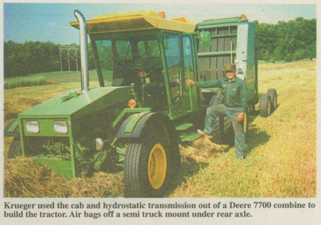 "People can't believe it when they see it," says Krueger, who used the tractor for the first time last summer. "I built it because I bale hay over a 40-mile area and spend a lot of time on the highway between jobs. I wanted more speed on the road and a better ride in the field. My baler can handle a lot of hay, but in rough fields with a conventional tractor I couldn't go fast because I could hardly stay in the seat. The combination of the air bags, suspension seat, dual rear truck tires, and tandem axles on the baler smoothes out the ride. The lugged truck tires provide traction and flotation.