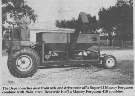 The Depenbusches next built a 7-ft. wide by 10-ft. long frame out of 6 in. channel iron and mounted it on the Super 92's axle. For the cart's rear axle, they used a rear axle off a burned out 410 Massey Ferguson combine. The cart's rear tires are old airplane tires.