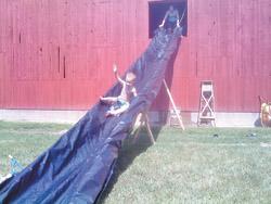 Early this summer, when the weather turned hot and our family started getting irritated with each other, I fashioned a 30-ft. long water slide to stretch from the hay mow in our barn out into the yard. Using some old poly barrels reclaimed from a friend’s barn, and some discarded 2 by 4’s from our wood shop, we found a way to beat the heat and save a trip to the water park.