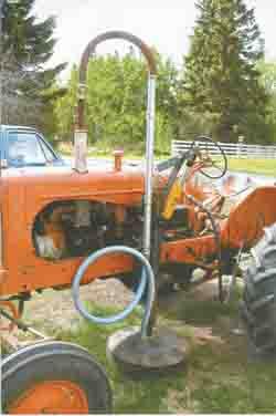 Ron Cole, Clive, Alta., converted his old Allis Chalmers WD tractor into a portable gopher gasser. The unit mounts on the left side of the tractor between the front and rear wheels.