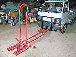 Walnofer then ran two more lengths of 2 by 2 from the L-shaped steel plate on the truck frame to the front. He bolted them to the plate and welded them to the tow hook-supported tube in front.