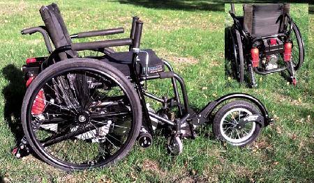 He later added a FreeWheel caster wheel system that turned the Invacare A4 wheelchair into a 3-wheeler for off-road use (www.gofreewheel.com). He also reinforced the wheelchair's foot platform supports to take the twisting force off the large third wheel.
