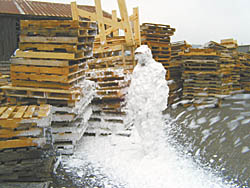"Foam puts out fires very fast," Hunter says. Unlike water, which skips over some surfaces, such as smoldering hay, the detergent-based foam penetrates. Since it lasts a couple hours, foam can also be used as a preventative measure to coat a building before a fire reaches it.