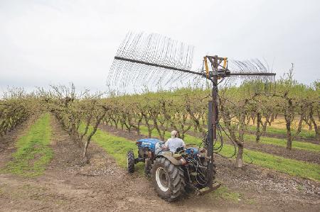 The Darwin String Thinner has a 10-ft. rotating spindle with 2-ft. long strings spaced every inch along the spindle. Bavaro used the original hydraulic motors and orbital spinning shafts to develop 2 thinners. For top thinning, he mounted the thinning shaft horizontally on a high post. This allows it to break up blossoms on the tops of trees. The second unit has a shaft mounted vertically on a pivoting arm. This arm is manually controlled by a worker walking behind the machine. He can move it in and out to match the shape of the trees.
